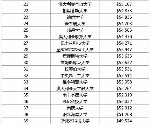 从澳大利亚39所大学的排行榜结果来看,西澳大学的毕业生薪金为全澳第一,塔斯马尼亚大学也凭借AUD$57,547 的毕业生起薪位列前十。其他大学,如卧龙岗大学,西悉尼大学在毕业生薪资排名中的表现也十分良好,分别排在澳洲39所院校的第6位和第9位。